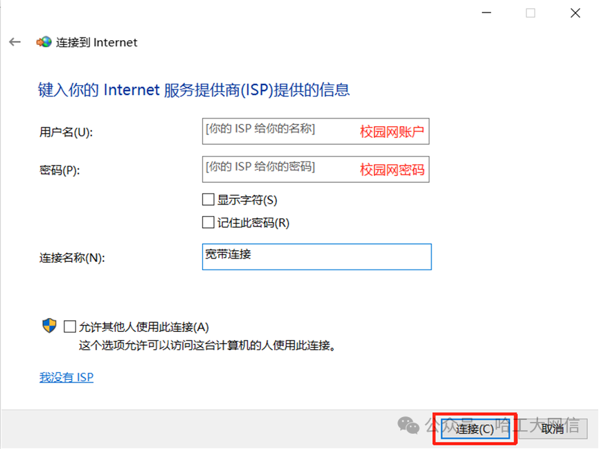 4. After the setup is finished, you can use the campus network by directly clicking the dial-up connection saved in the settings.