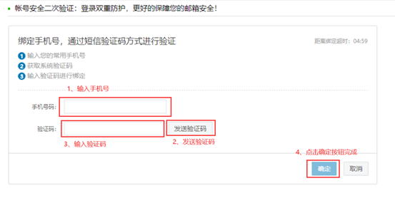 When logging into the email for the first time, a two-factor authentication interface will pop up. Select SMS Verification Code and proceed to the next step, enter your mobile phone number, send the verification code, then input the received verification code and click the Confirm button to enable two-factor authentication.