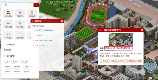 The campus map is equipped with an information retrieval function, allowing for fuzzy search by keywords and categorized information search.